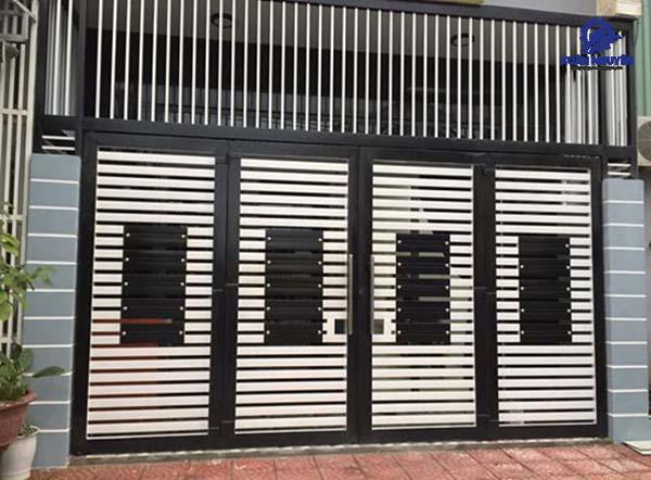 Cửa cổng sắt hộp 4 cánh có kết cấu gồm 4 cánh cửa cùng kích thước ghép lại với những thanh sắt được đặt song song theo chiều ngang, chiều dọc, có thể kết hợp với các hoa văn để cho ra đời nhiều mẫu thiết kế ấn tượng độc đáo